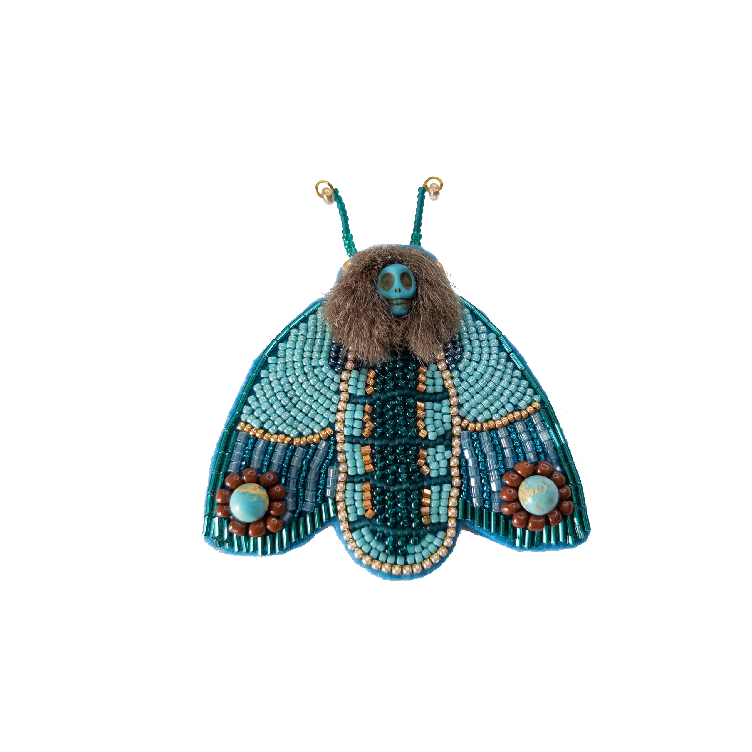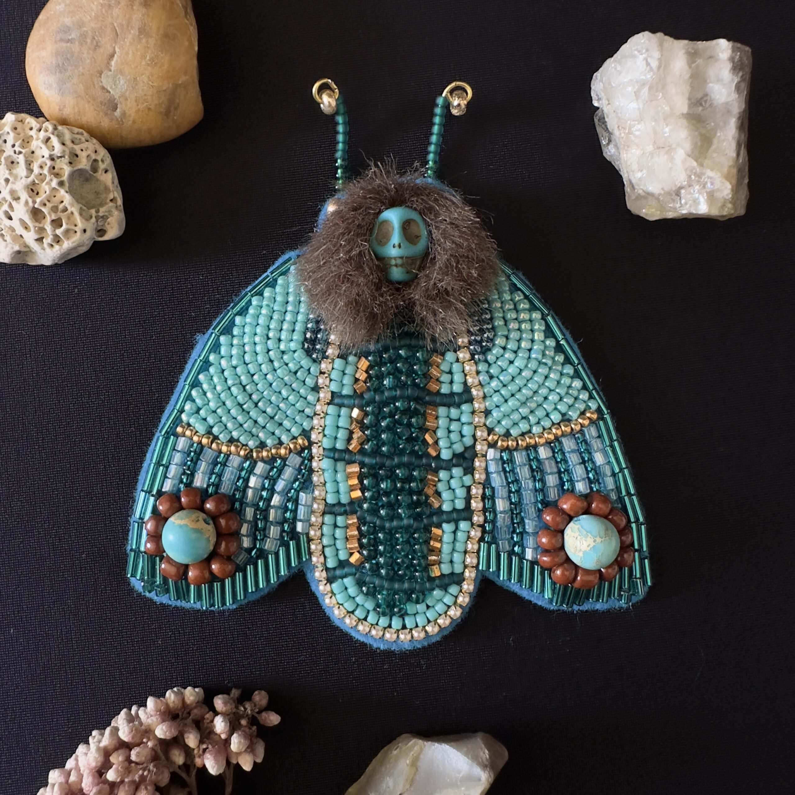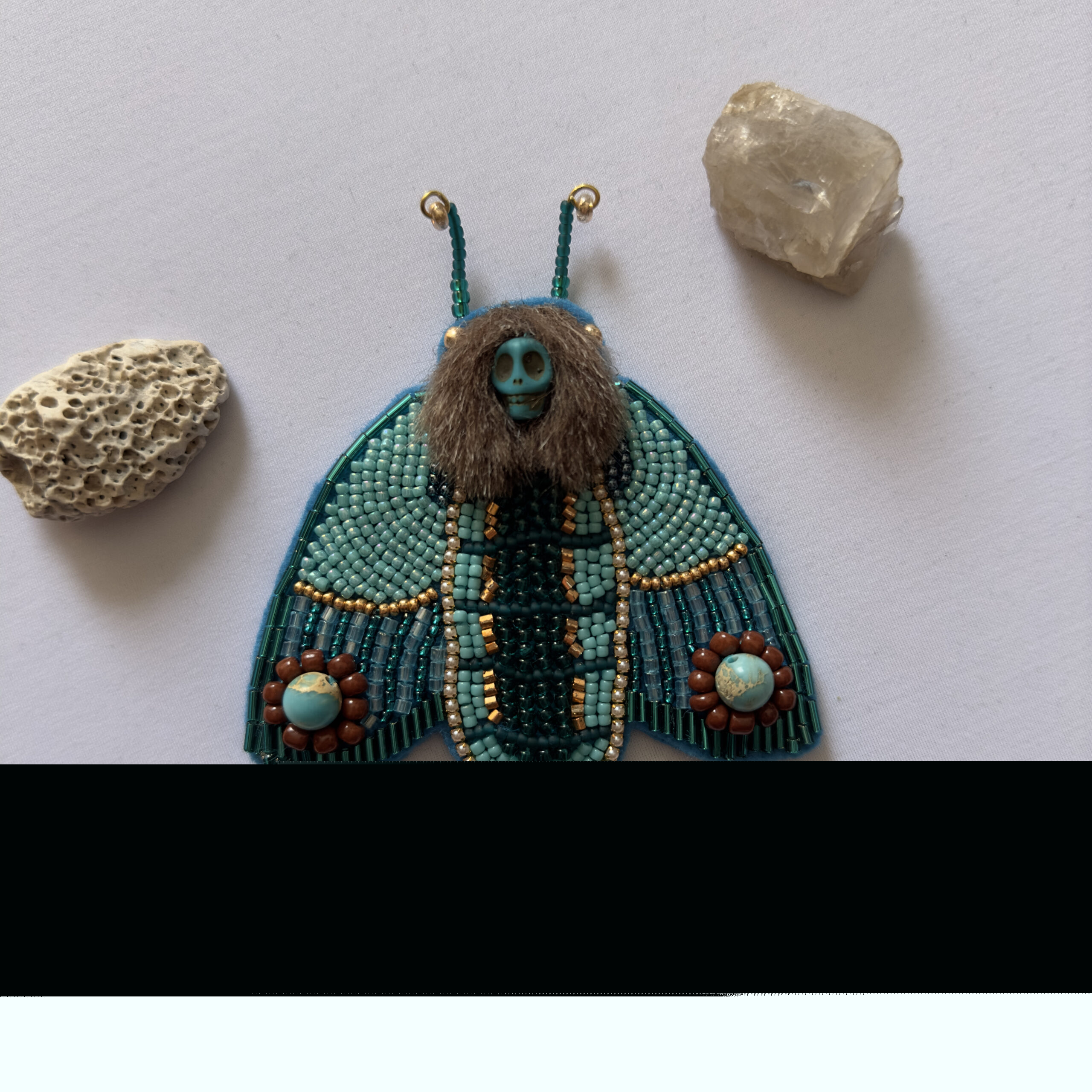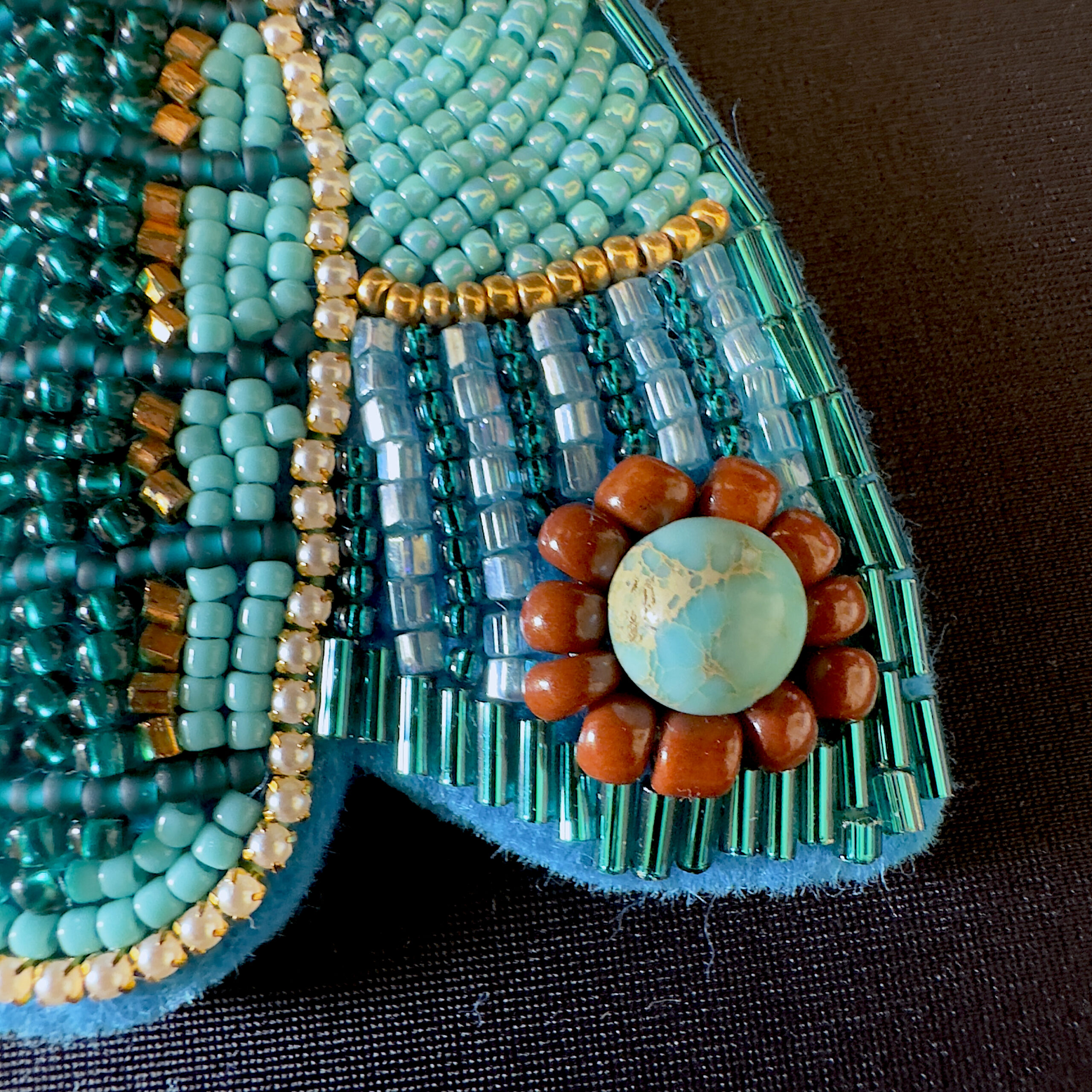 Plsťěná brož, zdobená korálky z jaspisu, howlitu a skla.