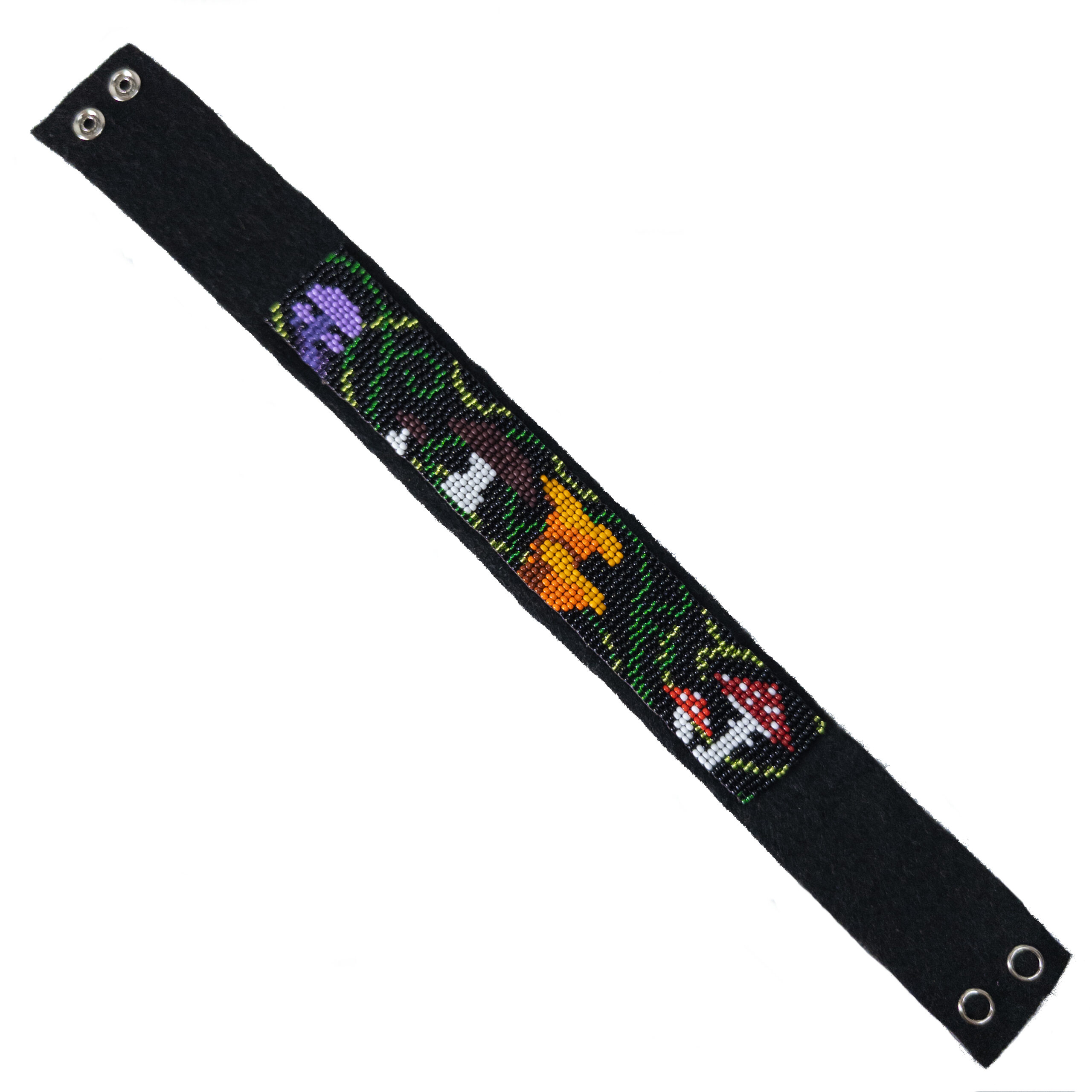 Tento výrazný choker je dokonalou kombinací originality a přírody. Na černém plstěném podkladu se nachází ručně vyšívaný vzor lesních hub, který ožívá díky preciznímu použití skleněných korálků. Druky zajišťují pohodlné zapínání.
