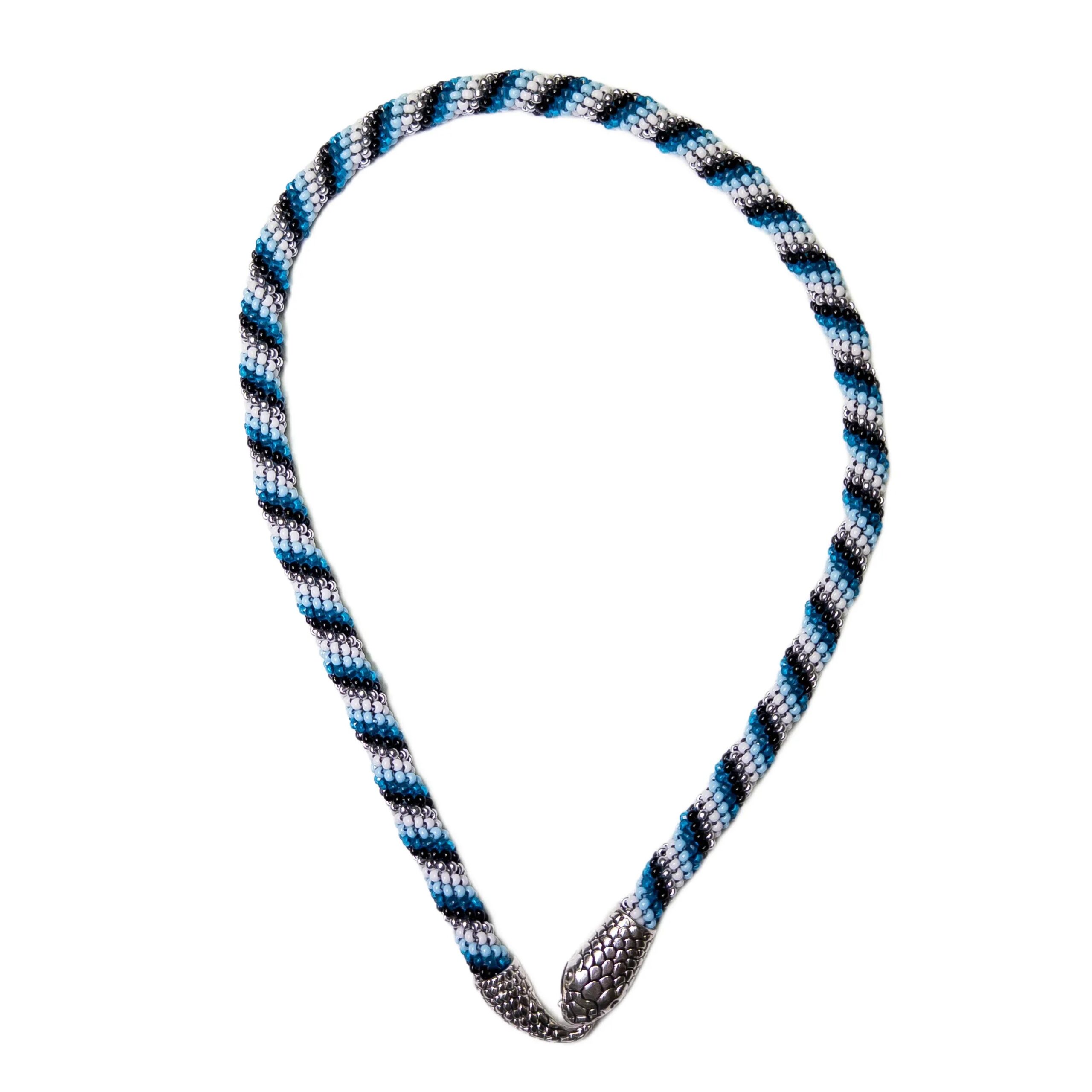 Tento ručně šitý náhrdelník ve tvaru hada zaujme výraznou kombinací černé, stříbrné a modré. Díky originálnímu designu a preciznímu zpracování je dokonalým doplňkem, který dodá každému outfitu jedinečný styl. Náhrdelník je vyrobený z bižuterního kovu a má délku 46 cm.
