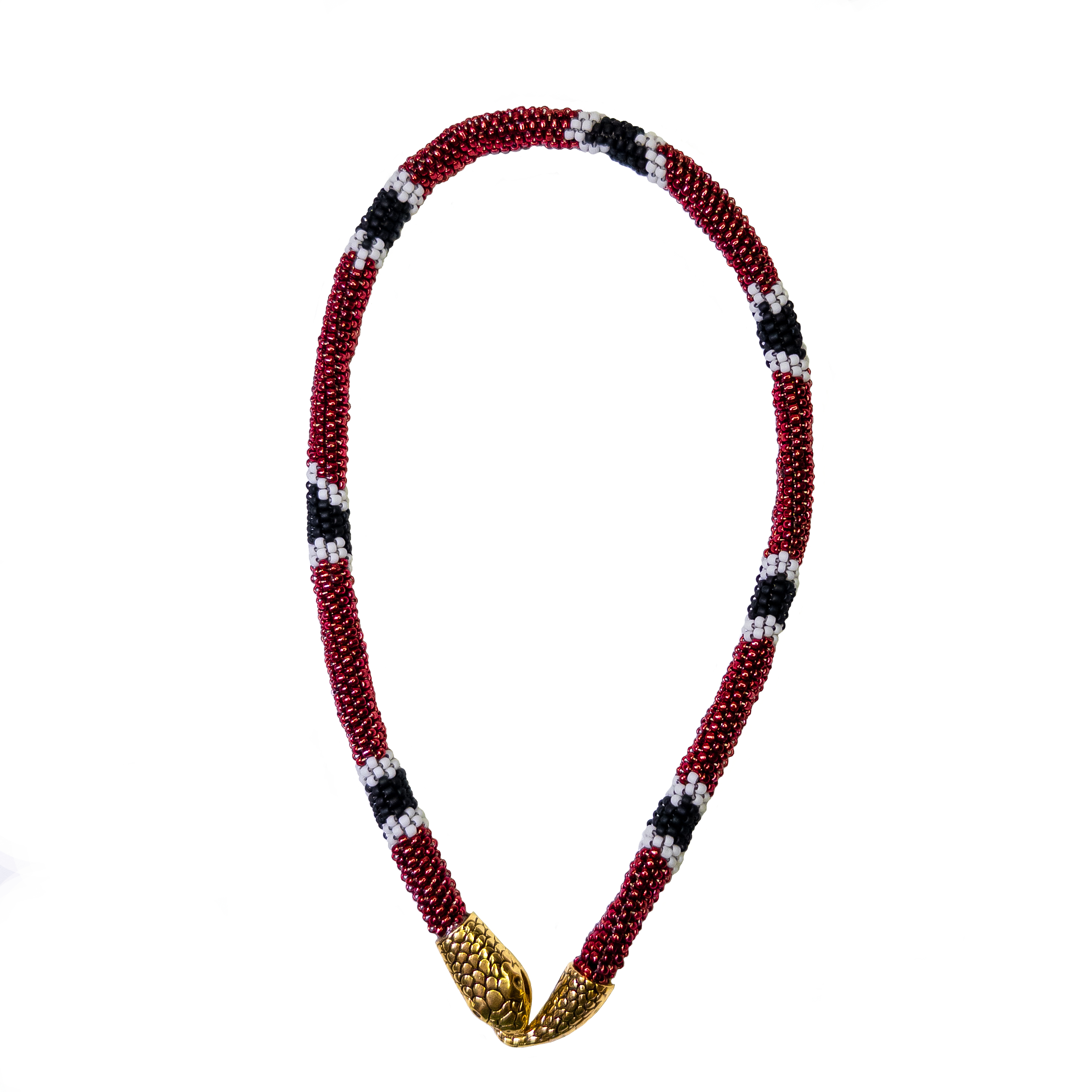 Tento originální šitý náhrdelník o délce 42 cm je inspirován vzorem hada korálovky, což se odráží v jeho výrazném barevném provedení. Kombinace červených, černých a bílých skleněných korálků tvoří jedinečný design, který dokonale napodobuje přirozené zbarvení tohoto fascinujícího tvora. Zapínání ve tvaru hadí hlavy v zlatém odstínu přidává šperku výrazný a sofistikovaný prvek.