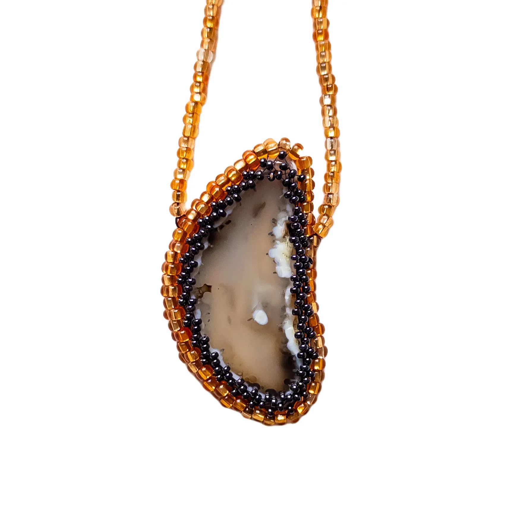 Tento náhrdelník s achátem je symbolem elegance a jemné síly. Překrásný kámen, zasazený do korálkového rámečku v odstínech oranžové a metalické černé, vytváří harmonii barev a přitahuje pohledy svou sofistikovaností. Achát, kámen klidu a stability, vás obklopí ochranou energií a přináší rovnováhu do vašeho života.