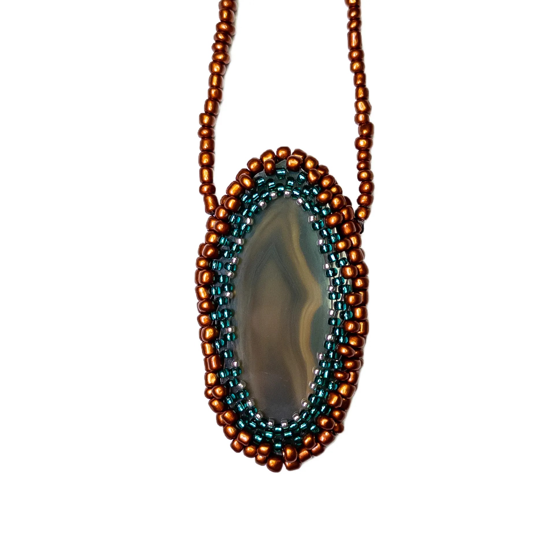 Tento náhrdelník s achátem je symbolem elegance a jemné síly. Překrásný kámen, zasazený do korálkového rámečku v odstínech měděné,tyrkysové a stříbrné, vytváří harmonii barev a přitahuje pohledy svou sofistikovaností. Achát, kámen klidu a stability, vás obklopí ochranou energií a přináší rovnováhu do vašeho života.