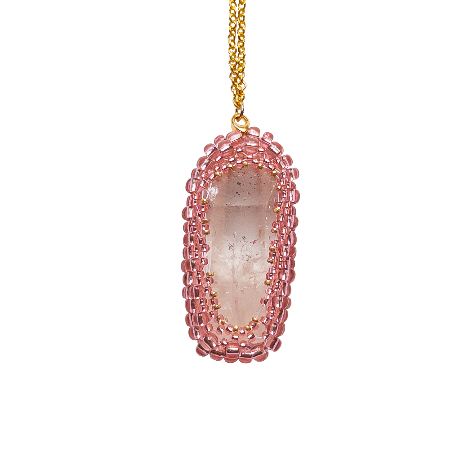 Tento jedinečný náhrdelník spojuje krásu přírodního křišťálu a jemnost skleněných korálků v růžové a zlaté barvě. Ručně obšitý křišťál je známý svou schopností přinášet vnitřní harmonii, čistit energii a posilovat duševní rovnováhu. Díky tomu je tento náhrdelník nejen krásným šperkem, ale i mocným talismanem pro každodenní nošení.