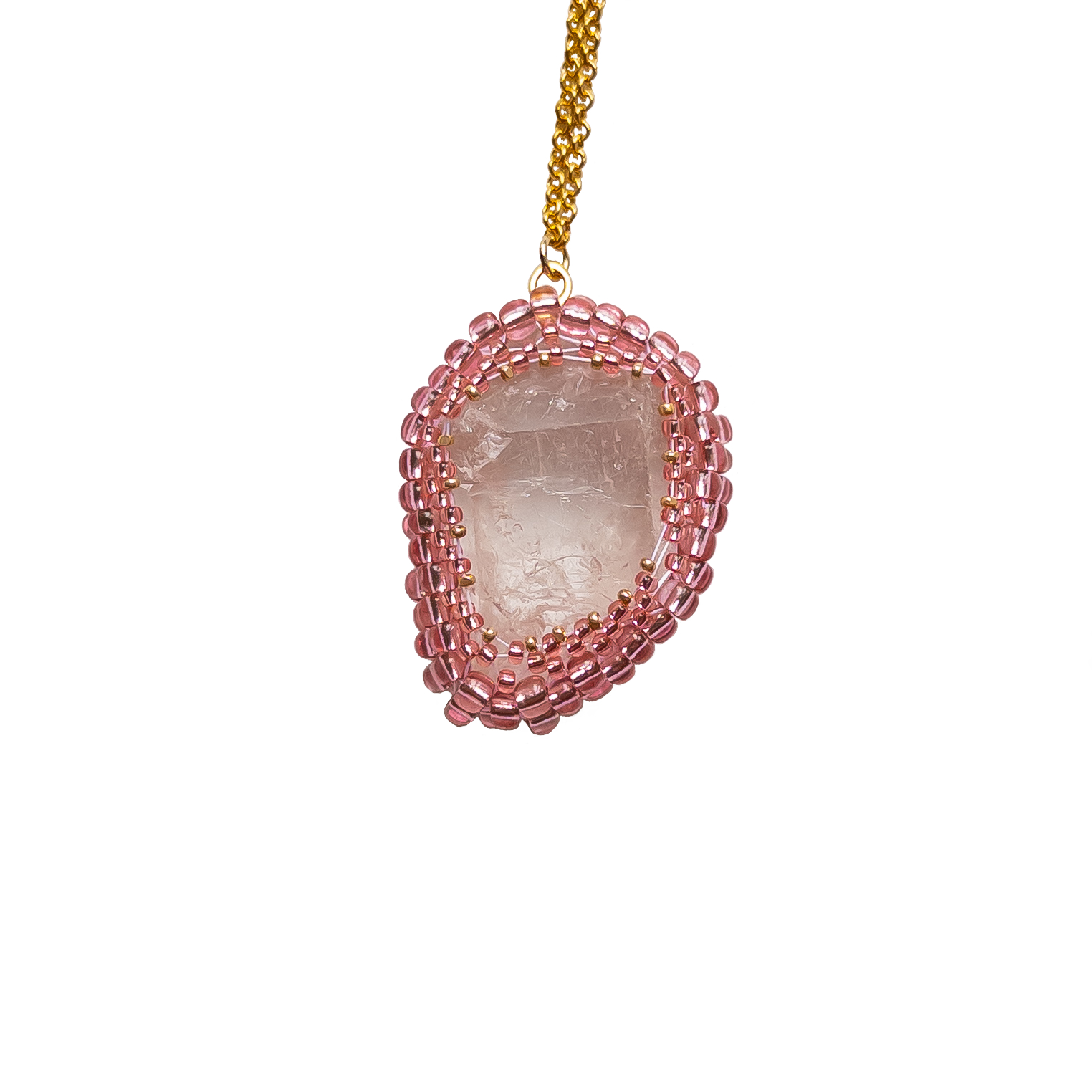 Tento jedinečný náhrdelník spojuje krásu přírodního křišťálu a jemnost skleněných korálků v růžové a zlaté barvě. Ručně obšitý křišťál je známý svou schopností přinášet vnitřní harmonii, čistit energii a posilovat duševní rovnováhu. Díky tomu je tento náhrdelník nejen krásným šperkem, ale i mocným talismanem pro každodenní nošení.