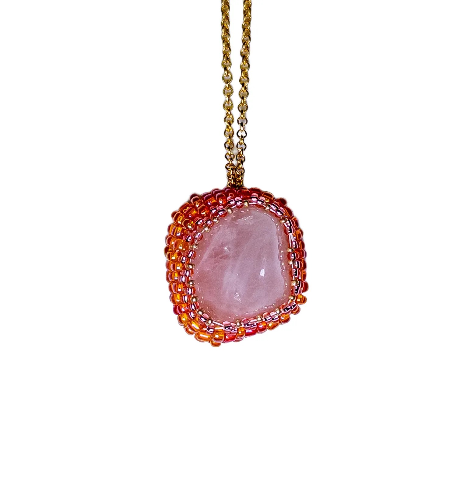 Tento nádherný náhrdelník je vytvořen z růženínu, kamene lásky a harmonie, který přináší klid a podporuje pozitivní energii. Obšitý jemnými oranžovými, růžovými a lehce zlatými korálky, šperk září měňavými odstíny a jemnou elegancí.
