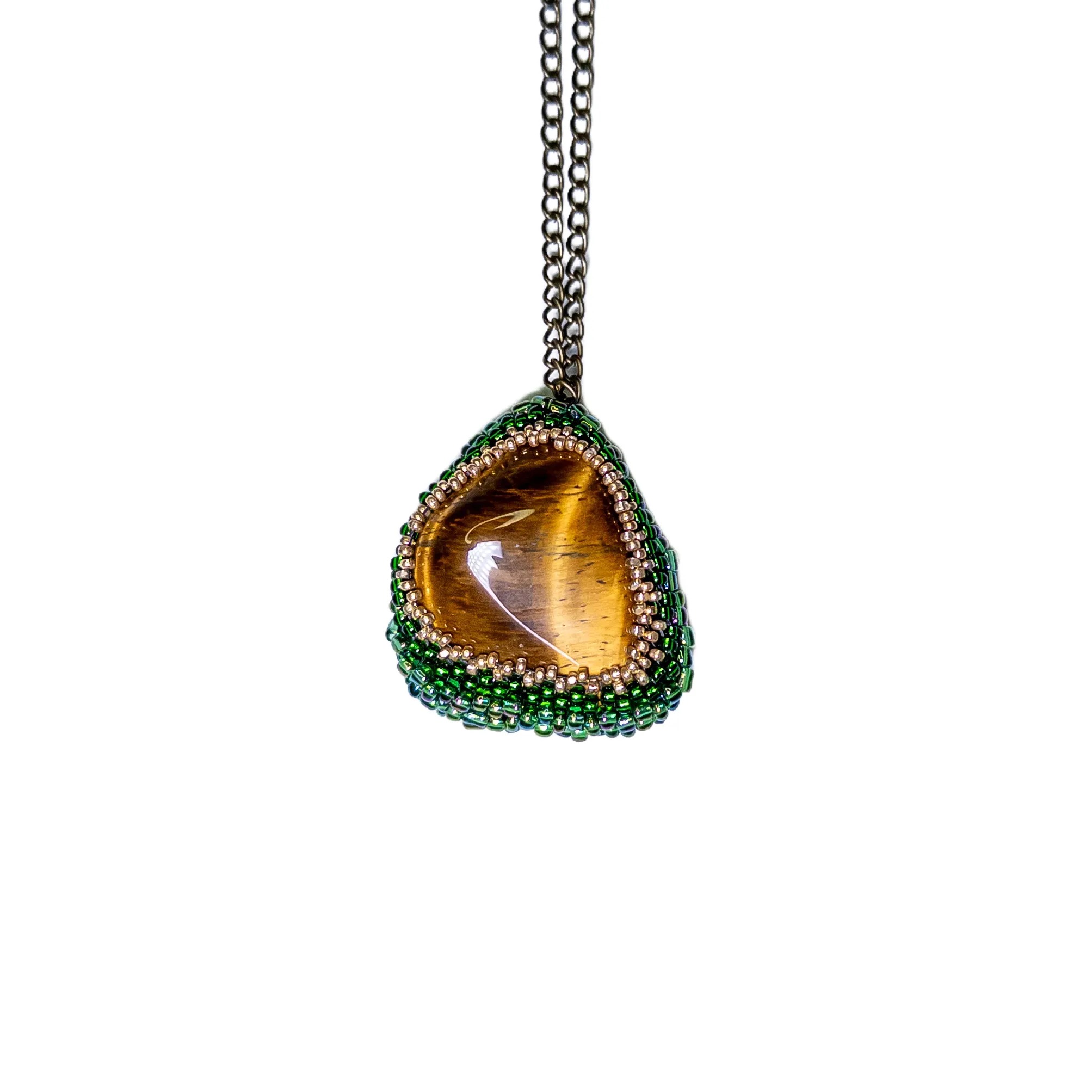 Tento náhrdelník z tygřího oka, kamene odvahy a síly, přináší vnitřní stabilitu a posiluje sebedůvěru. Obšitý zelenými a zlatými korálky, šperk vyniká přírodním kontrastem a elegantními barvami.