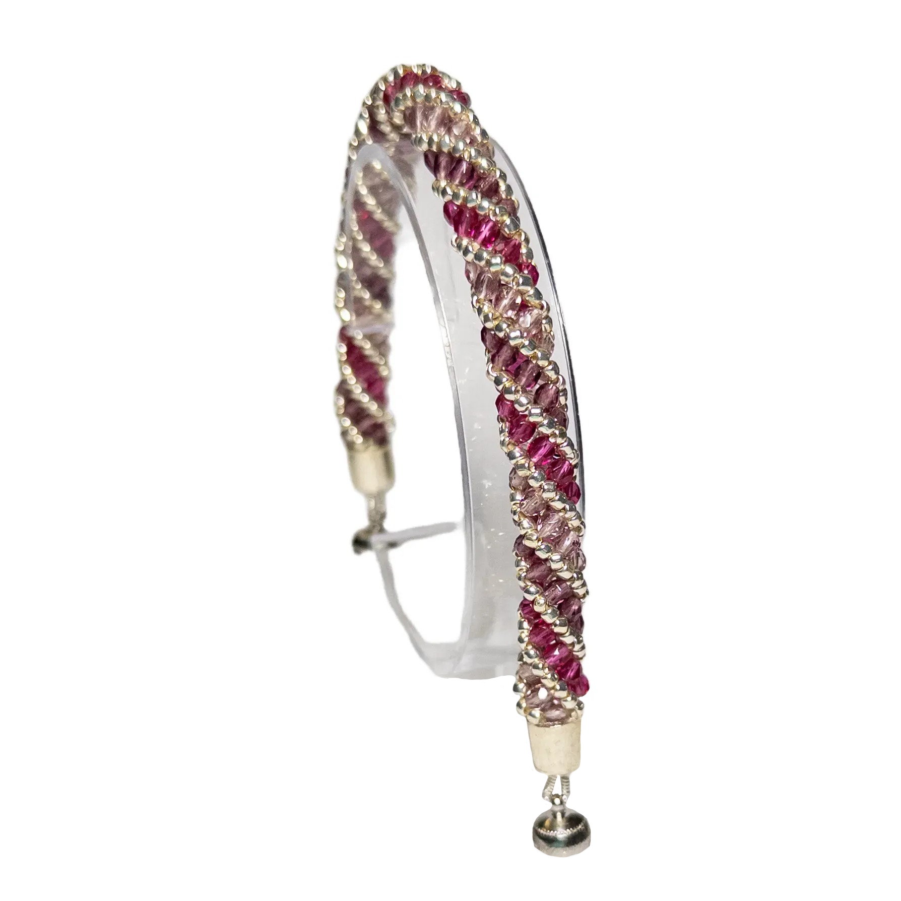 Tento ručně vyráběný náramek ze skleněných korálků vyniká svým unikátním spirálovým vzorem, který kombinuje jemné odstíny stříbrné růžové a fialové. Díky propracovanému designu se stane elegantním doplňkem, který okamžitě zaujme. Náramek má praktické magnetické zapínání, které zajistí pohodlné nošení a snadné zapínání i odepínání.
