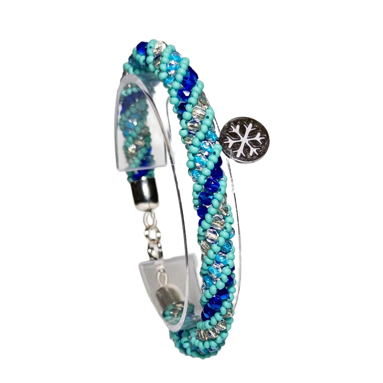 Tento elegantní náramek je ručně vyráběný ze skleněných korálků a je navržen v jemném spirálovém vzoru, který kombinuje odstíny tmavě a světle modré a stříbrné. Unikátní design a výrazné barvy dělají z tohoto náramku stylový doplněk, který oživí každý outfit. Náramek má očkové zapínání, které zajišťuje pevnost a snadné nasazení.