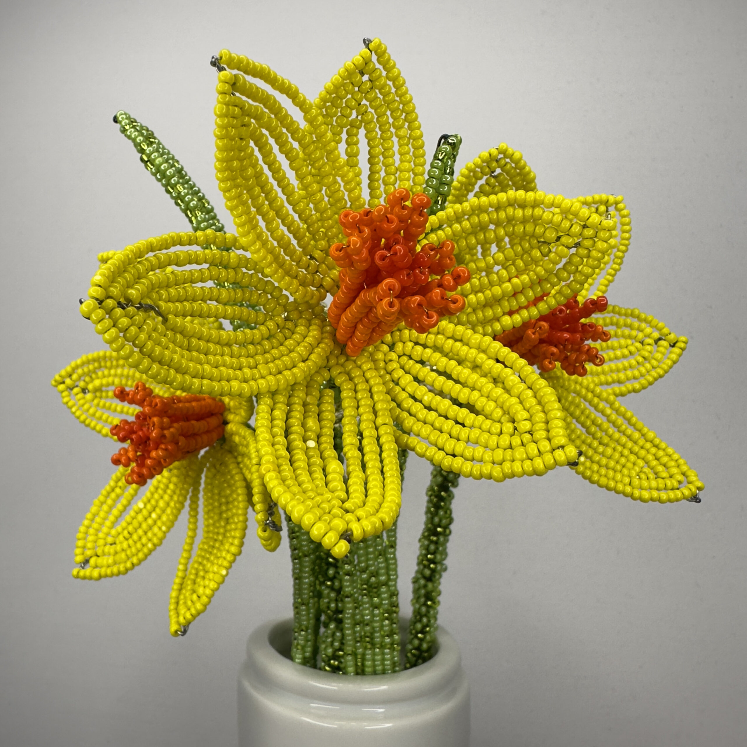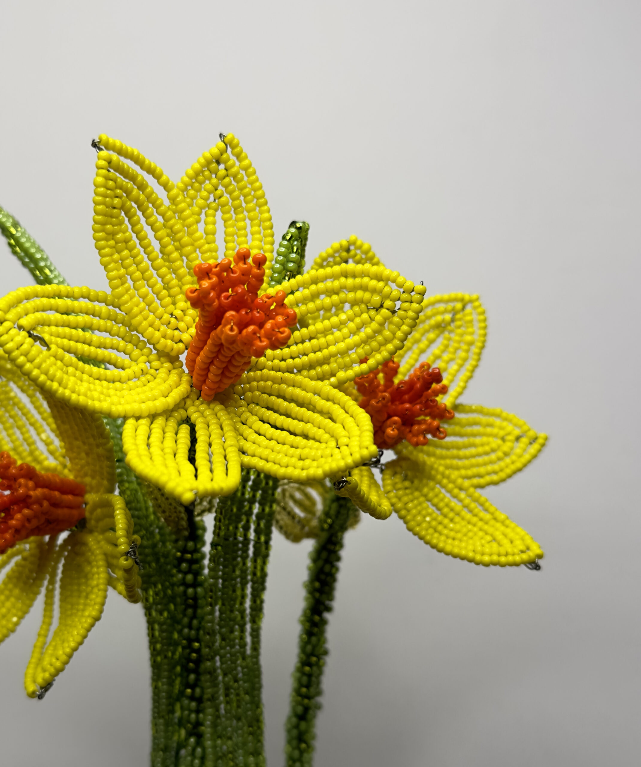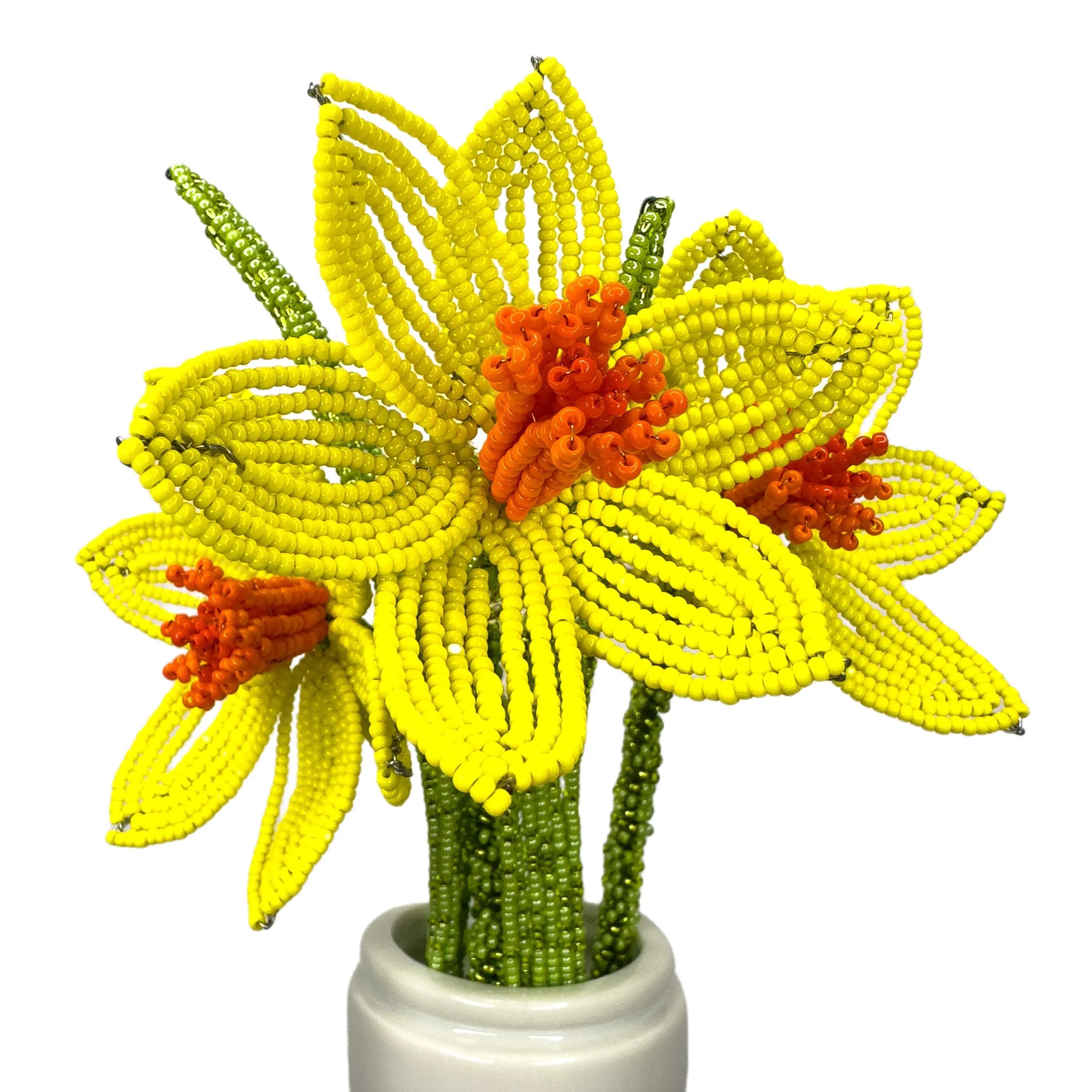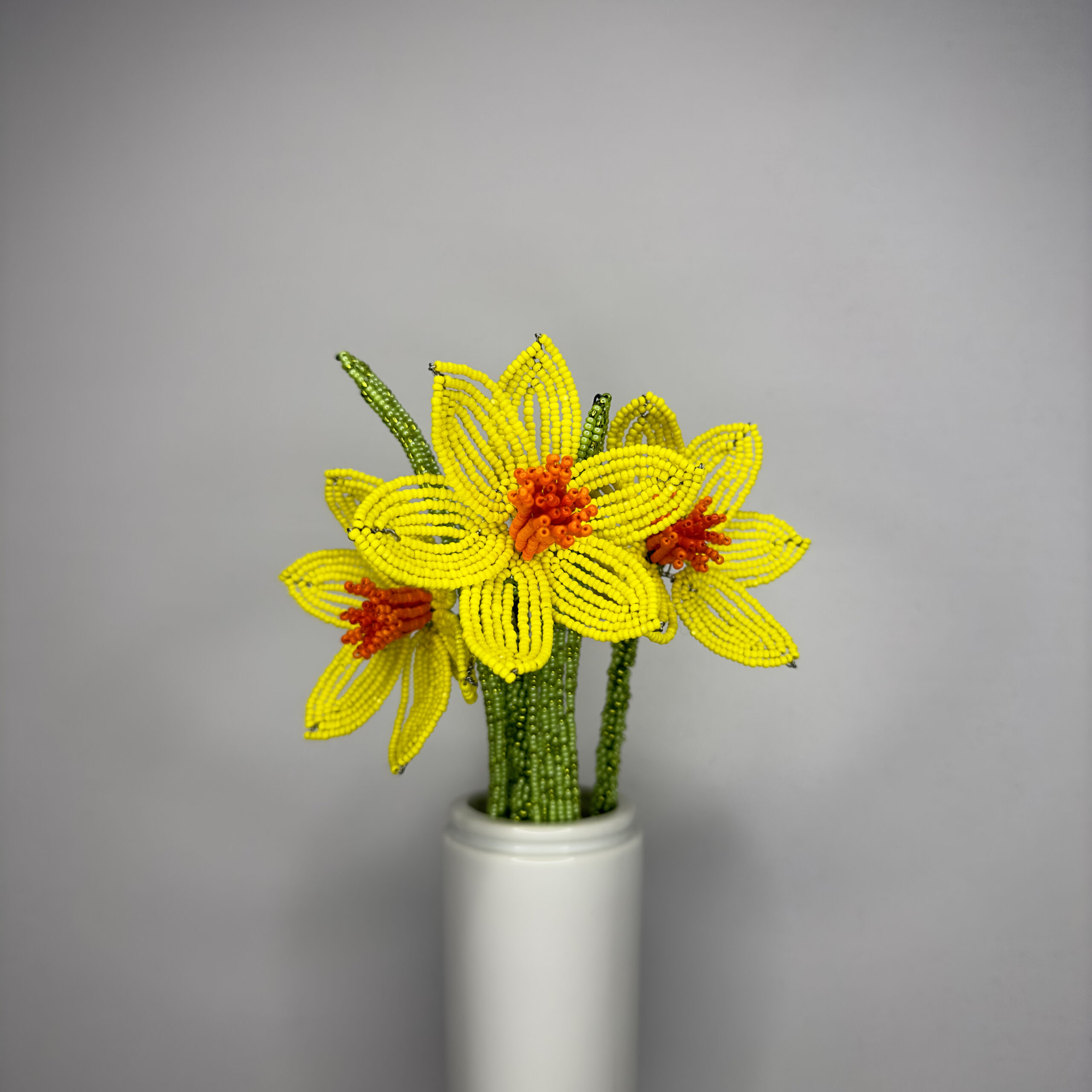Tento nádherný květ narcisů z korálků je ručně vyráběný s precizností a pečlivostí. Každý okvětní lístek i stonek jsou zhotoveny z kvalitních korálků, které dokonale napodobují skutečnou podobu narcisů – jasné žluté květy s oranžovými středy vynikají v každém prostoru. Tento dekorativní kousek je ideální volbou pro ty, kdo touží po trvalém květinovém aranžmá, které nikdy neuvadne. Ruční výroba zaručuje jedinečnost každého kusu.
