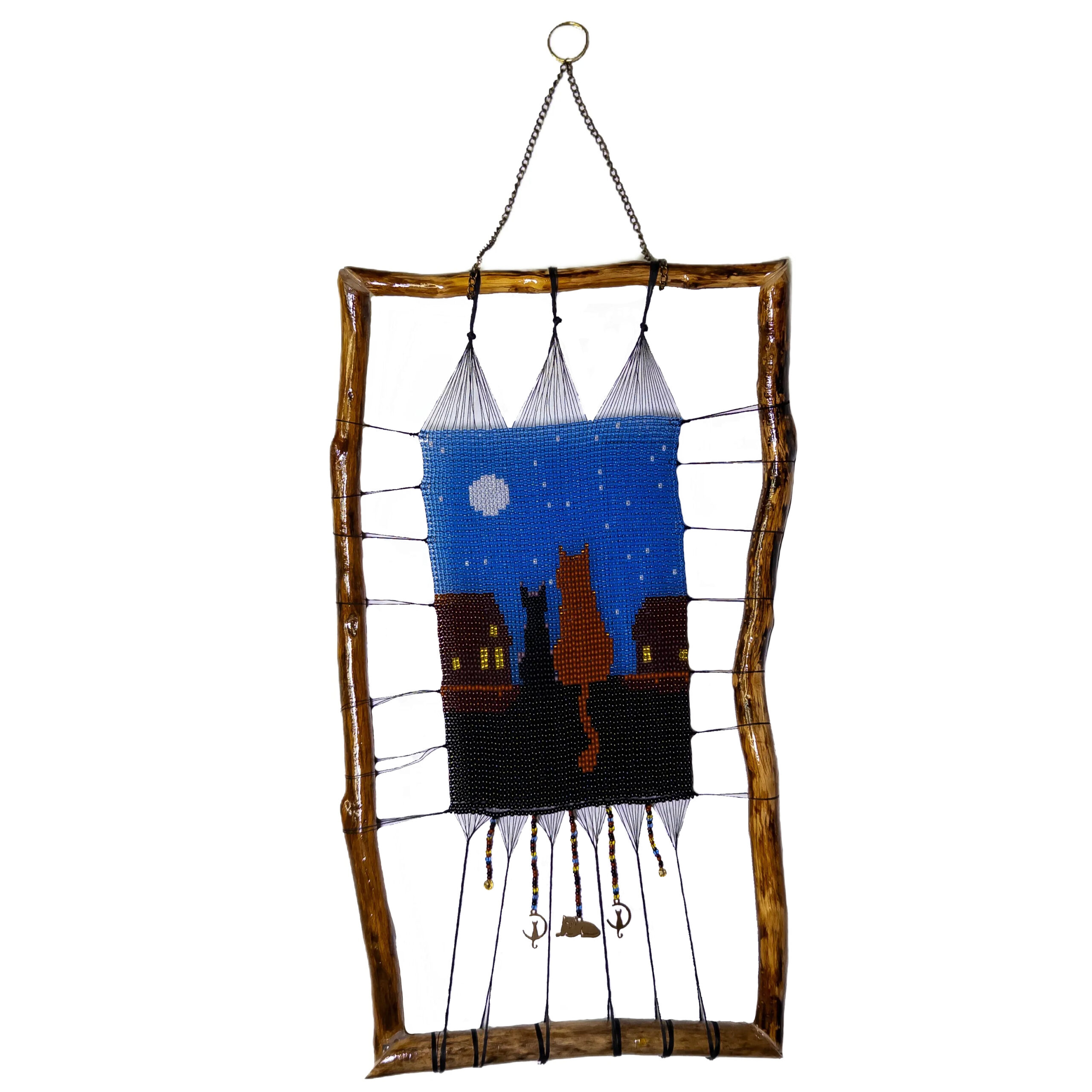 Rám je ručně vyroben z přírodního dřeva s nepravidelným tvarem, který podtrhuje jeho autentickou krásu a přirozený vzhled. Na spodní části obrazu visí jemné dekorativní prvky a korálky, které dodávají celému dílu dynamiku a osobitost.