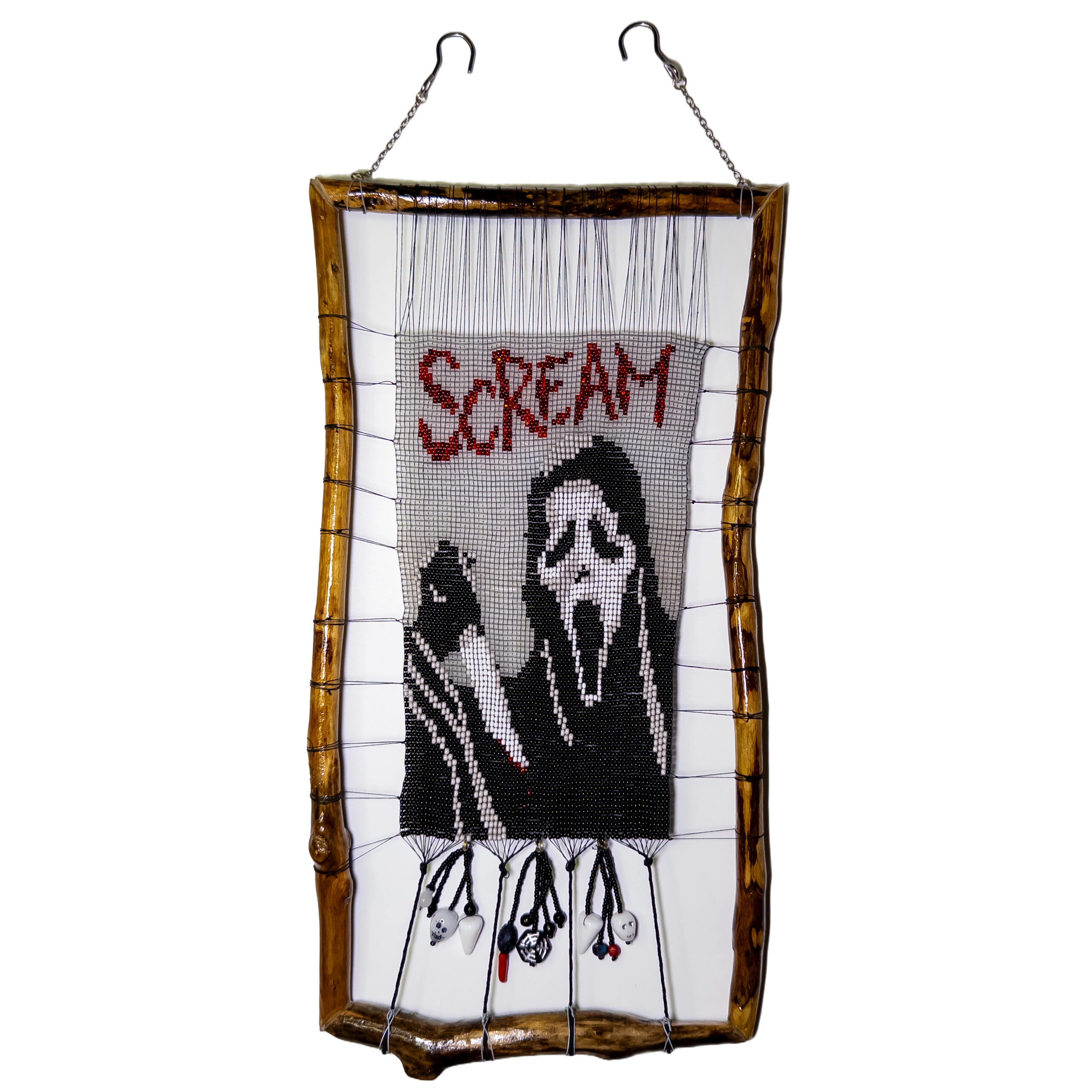 Rám obrazu je vytvořen z ručně opracovaného přírodního dřeva, jehož nepravidelné linie dodávají celku osobitost a přirozený charakter. Doplňující závěsné dekorace z korálků a symbolických prvků podtrhují unikátnost tohoto kousku.